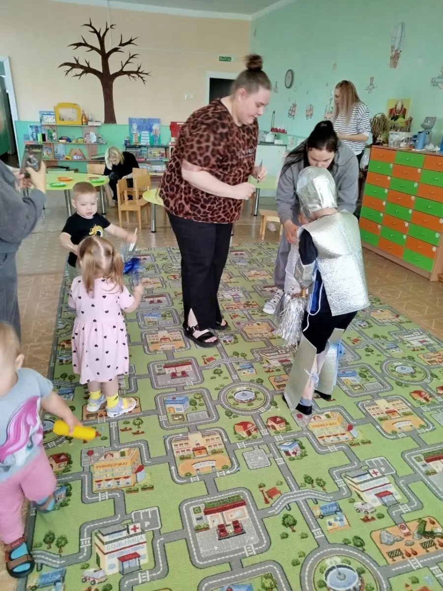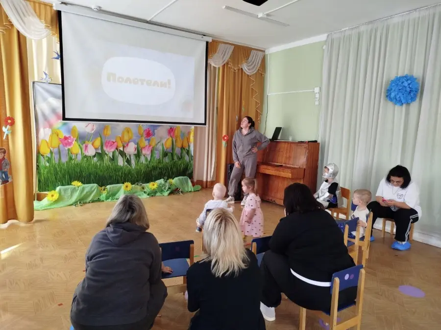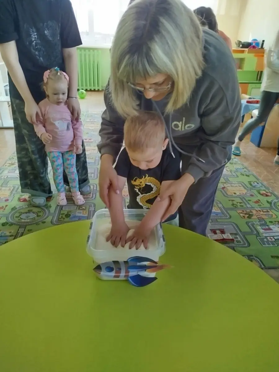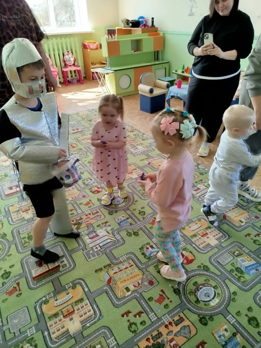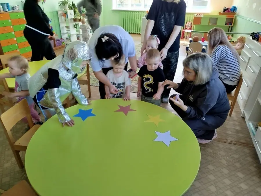 В игровой форме вместе с космонавтом будущего, с воспитанником старшей группы, малыши превратились в космонавтов и отправились на ракете в космос, наблюдая за планетами и звездами, эксперементировали с лунным песком, метеоритами, звёздной пылью. Играли в подвижные, музыкальные игры «Метеоритный дождь», «Разложи звезды по цвету» и др. Просмотрели мультфильм про космос «Малышарики — Ракета». Результатом занятия стало выполнение ребятами работ по образовательной области «Изобразительное искусство. Рисование, аппликации» - «Звёздное небо».