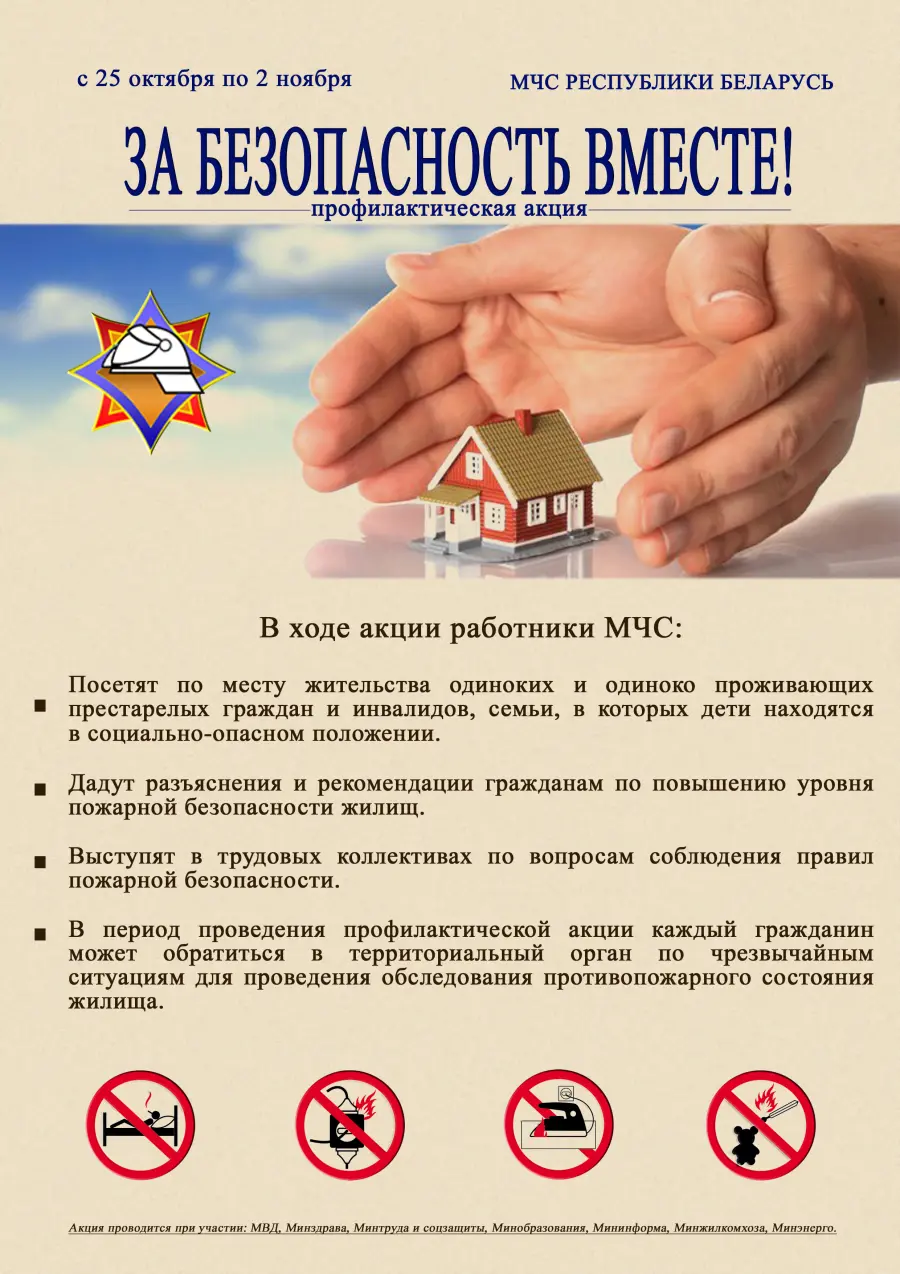 В целях повышения уровня культуры безопасности среди населения Министерством по чрезвычайным ситуациям в период с 25 октября по 2 ноября организовано проведение уже ставшей традиционной республиканской пожарно-профилактической акции по предупреждению пожаров и гибели людей от них в жилищном фонде «За безопасность вместе». К мероприятиям присоединятся Министерство внутренних дел, Министерство труда и социальной защиты, Министерство образования, Министерство информации, Министерство жилищно-коммунального хозяйства, Министерство здравоохранения и Министерство энергетики, Белорусское добровольное пожарное общество.